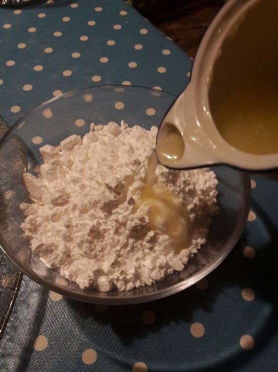 Puderzucker, 2 – 3 Eßl. Zitronensaft verrühren und den Kuchen damit